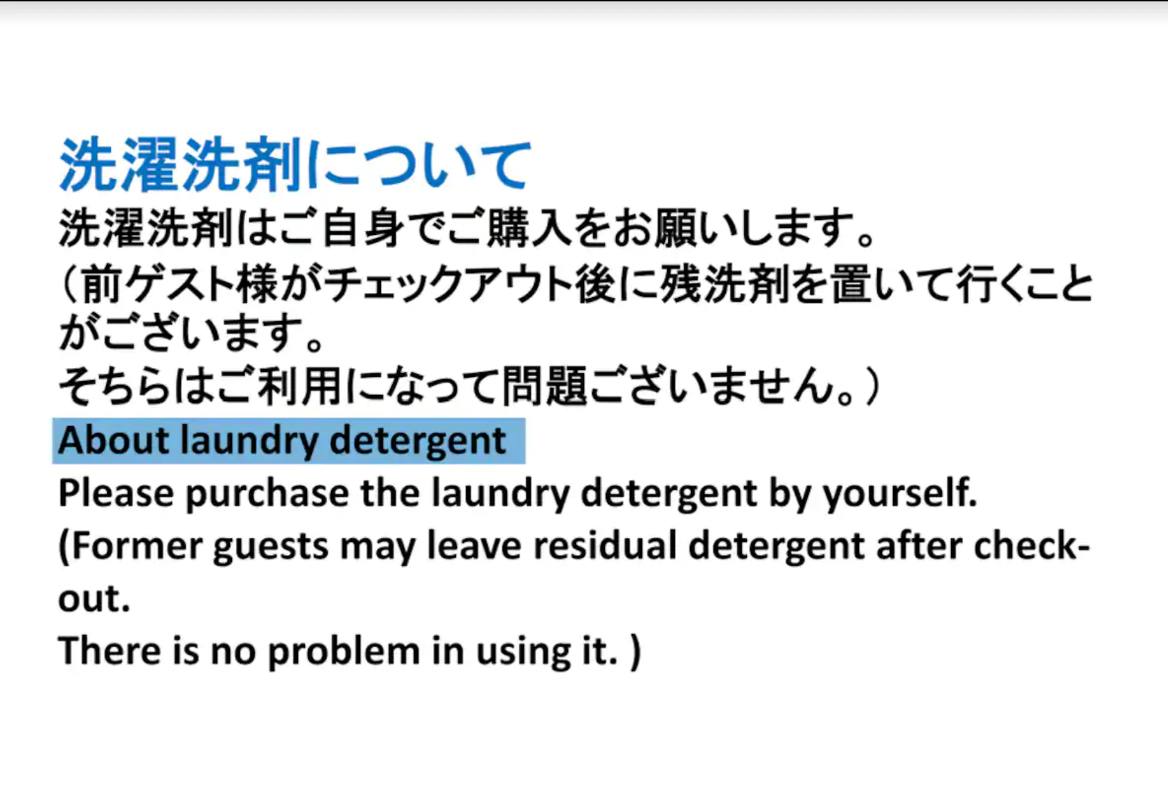 洗濯洗剤については基本持ち込みですが、前の人が置いていく場合があるのでその場合はタダで利用可能です。